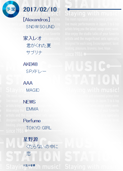 HOME > Topics > Topics 2/10放送のMステは2時間スペシャル!ドロス、星野源らが出演 投稿日:2017年2月6日 2/10放送のMステは2時間スペシャル!ドロス、星野源らが出演 http://www.tv-asahi.co.jp/music/contents/m_lineup/cur/ 続きを読む Twitter Share Google+ Pocket B!Hatena LINE -Topics
