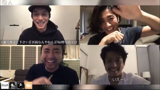 最初はキャップを被った錦戸が一人で登場すると、「シャワー浴びてました」とアメリカの自宅から赤西が参加。続いてメガネ姿で電子タバコをくわえた山田がラフに登場し、3人でトークをしていたが、最後に白Tシャツにヒゲ面の小栗も参加した。