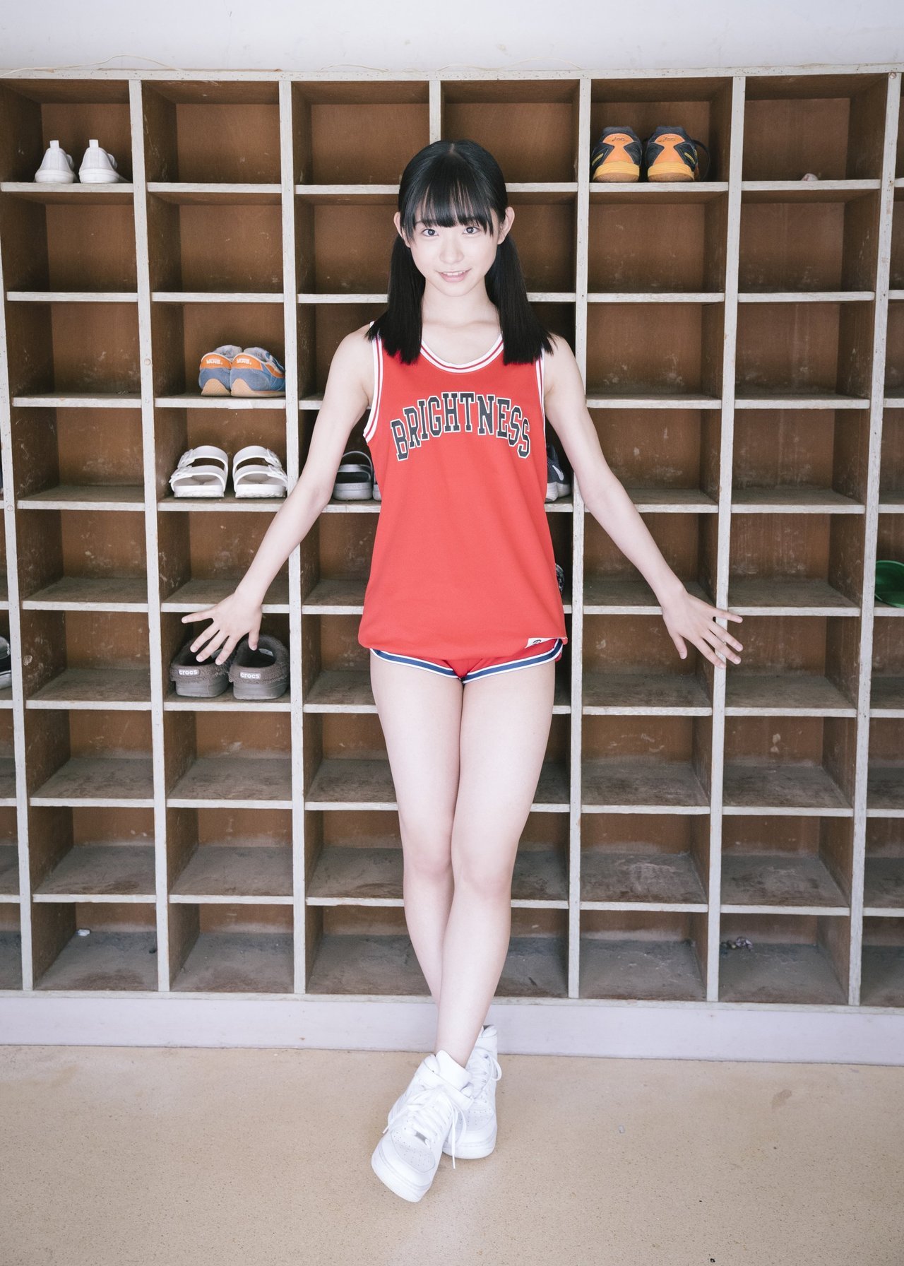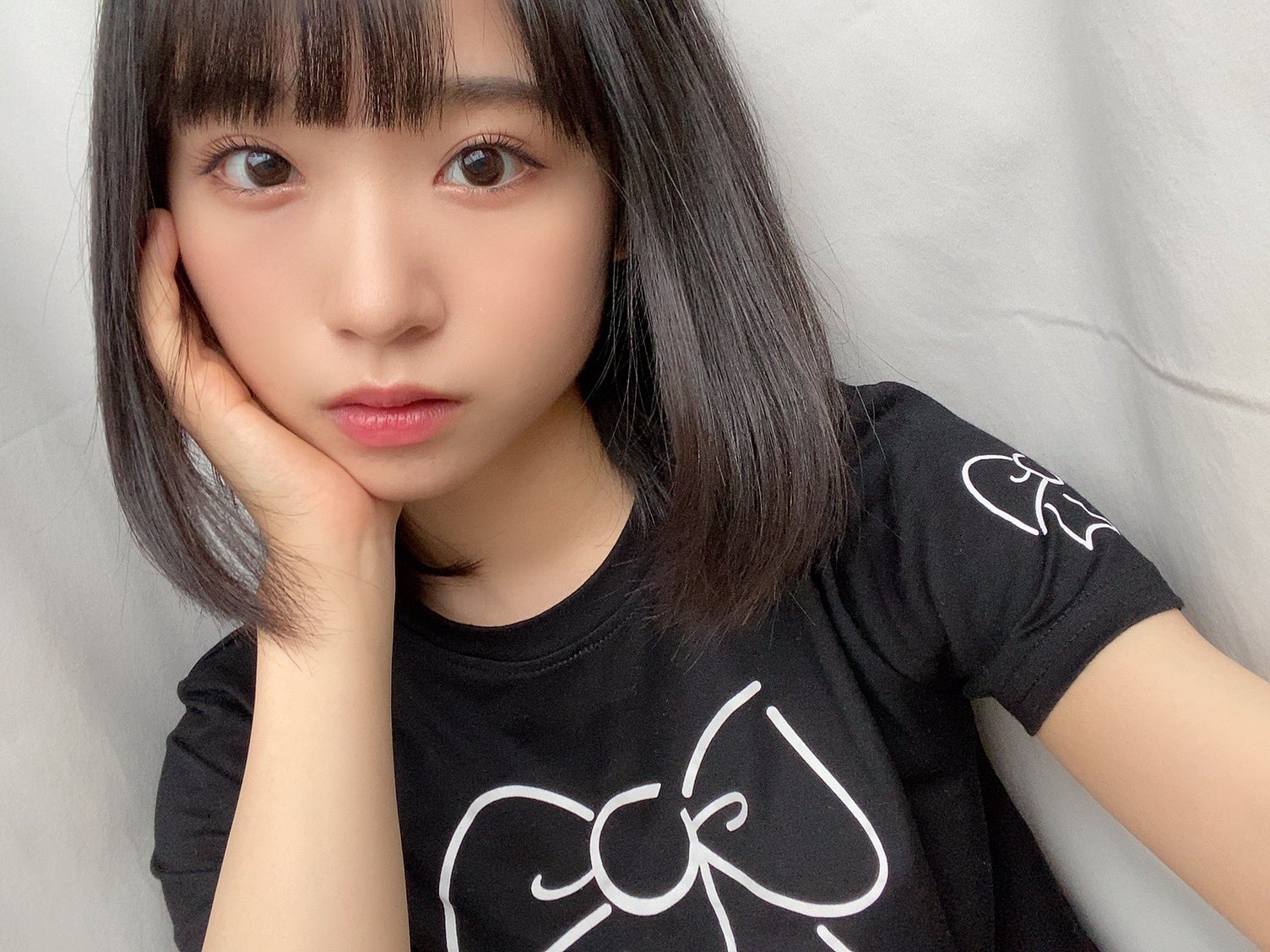 黒髪の毛先がくるんと内向きに巻かれており、黒いTシャツ姿で笑顔を見せたり、右手で頬杖をつくようなポーズも見せている。