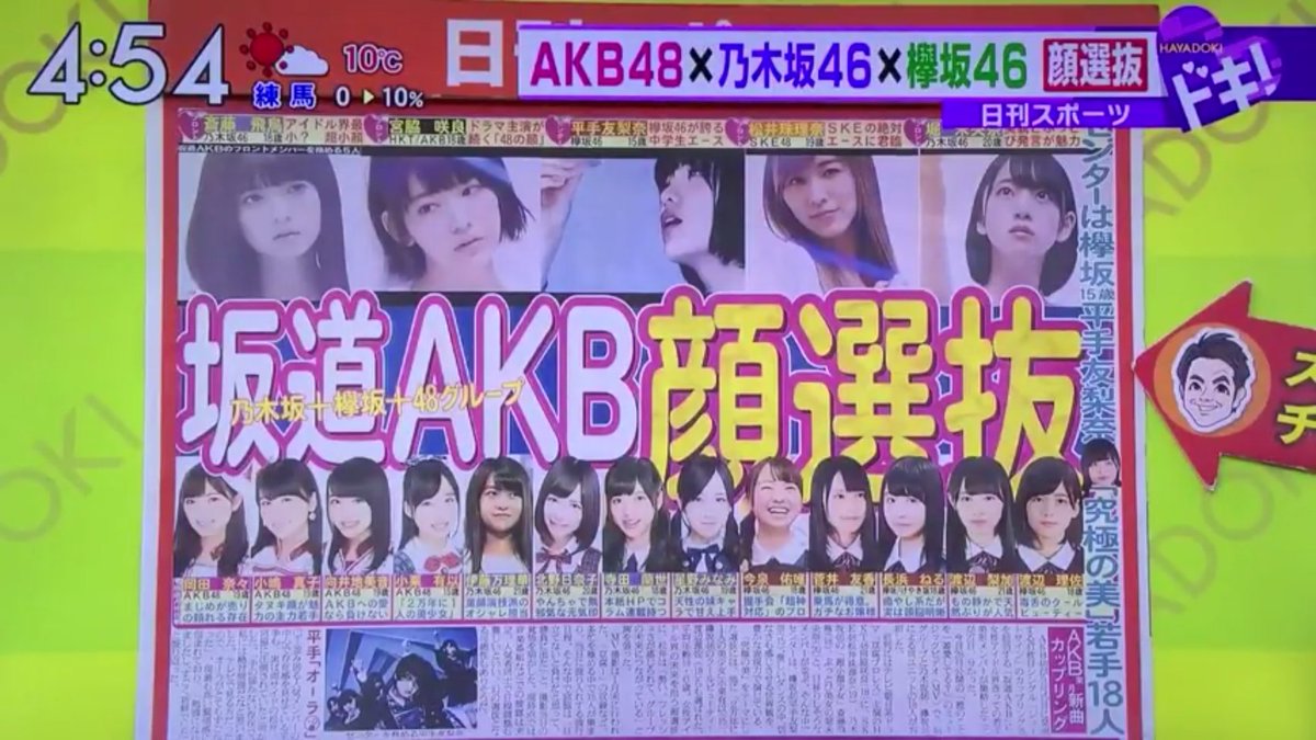 前列にはテレビ朝日系ドラマ「豆腐プロレス」主演のHKT48宮脇咲良(18)に、SKE48松井珠理奈(19)、乃木坂46の「超小顔少女」斎藤飛鳥(18)、ぶっとび美女の堀未央奈(20)と、目移りしそうなメンバーが並ぶ。