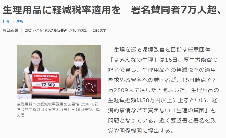 【#みんなの生理】生理用品に軽減税率適用を 署名賛同者7万人超、要望書提出へ