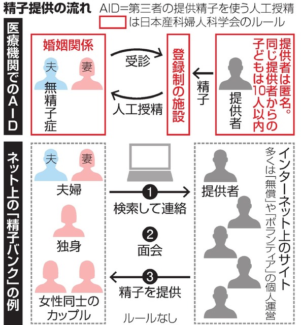 都内に住む20代後半の女性は「無償の精子バンク」を運営する男性の提供で、長女(1)を生んだ。胸に抱いた長女を見つめて「そっくりでしょ」と笑う。スマホには、長女によく似たまゆ毛の男性の写真が映っていた。「男性への恐怖心や嫌悪感」で結婚はしたくなかったが、子どもは欲しかった。医療施設ではAIDを受けられないため、ネットで提供者を探した。
