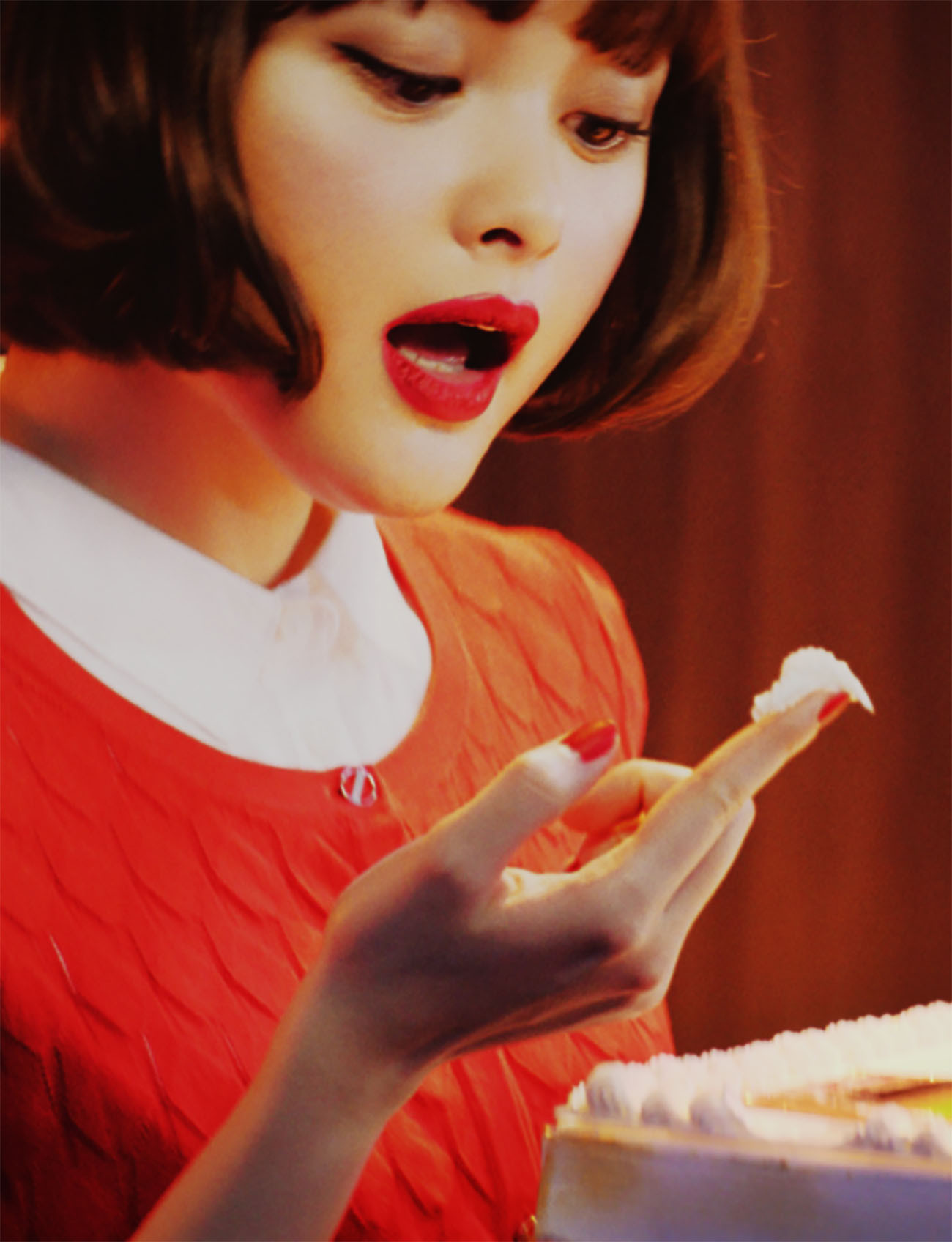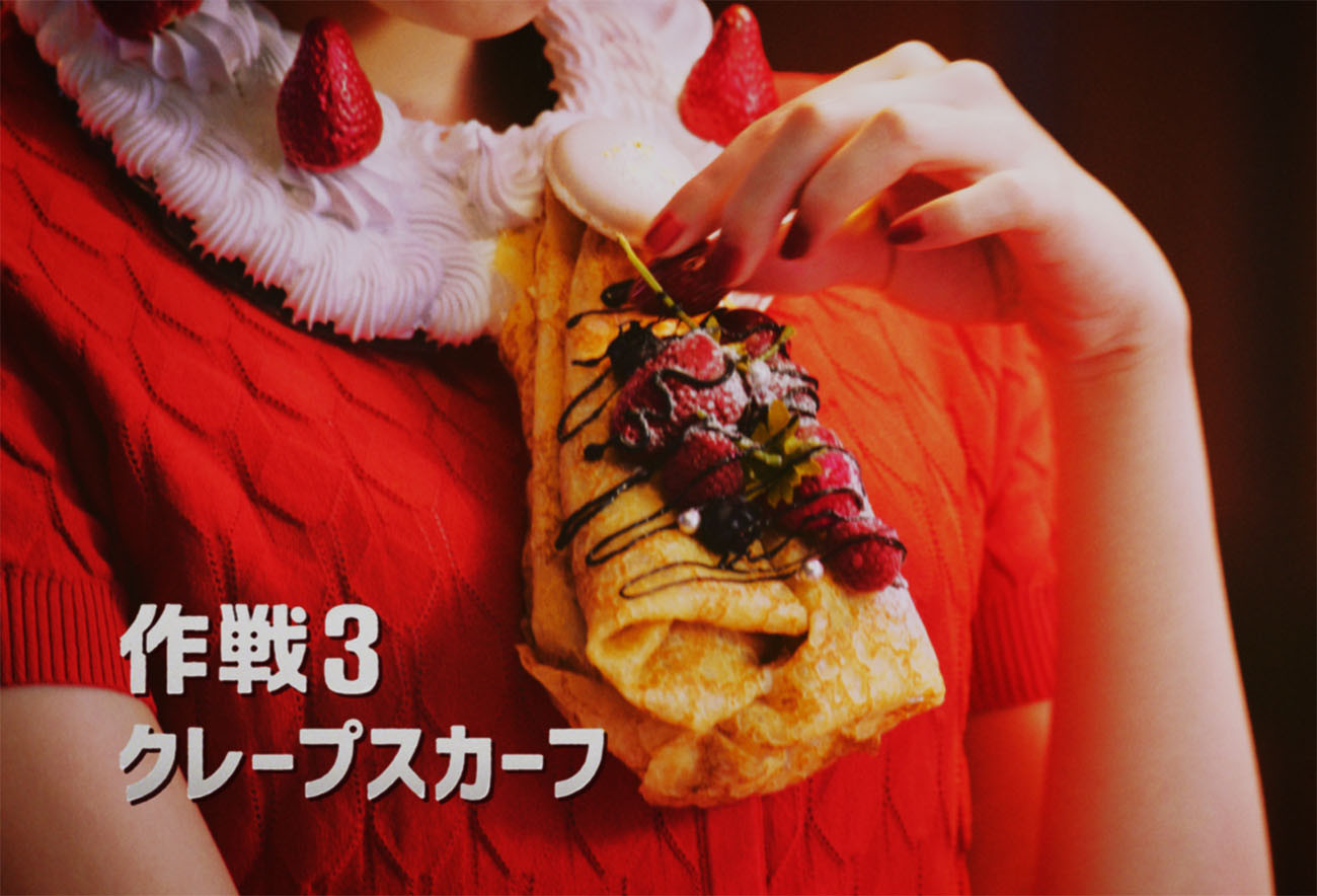 頭にモンブランを乗せ、ウイッグのフリをしながら食べる玉城ティナ氏。ケーキをファイルにカモフラージュさせて食べる玉城ティナ氏。苺たっぷりクレープをスカーフに模して食べる玉城ティナ氏。