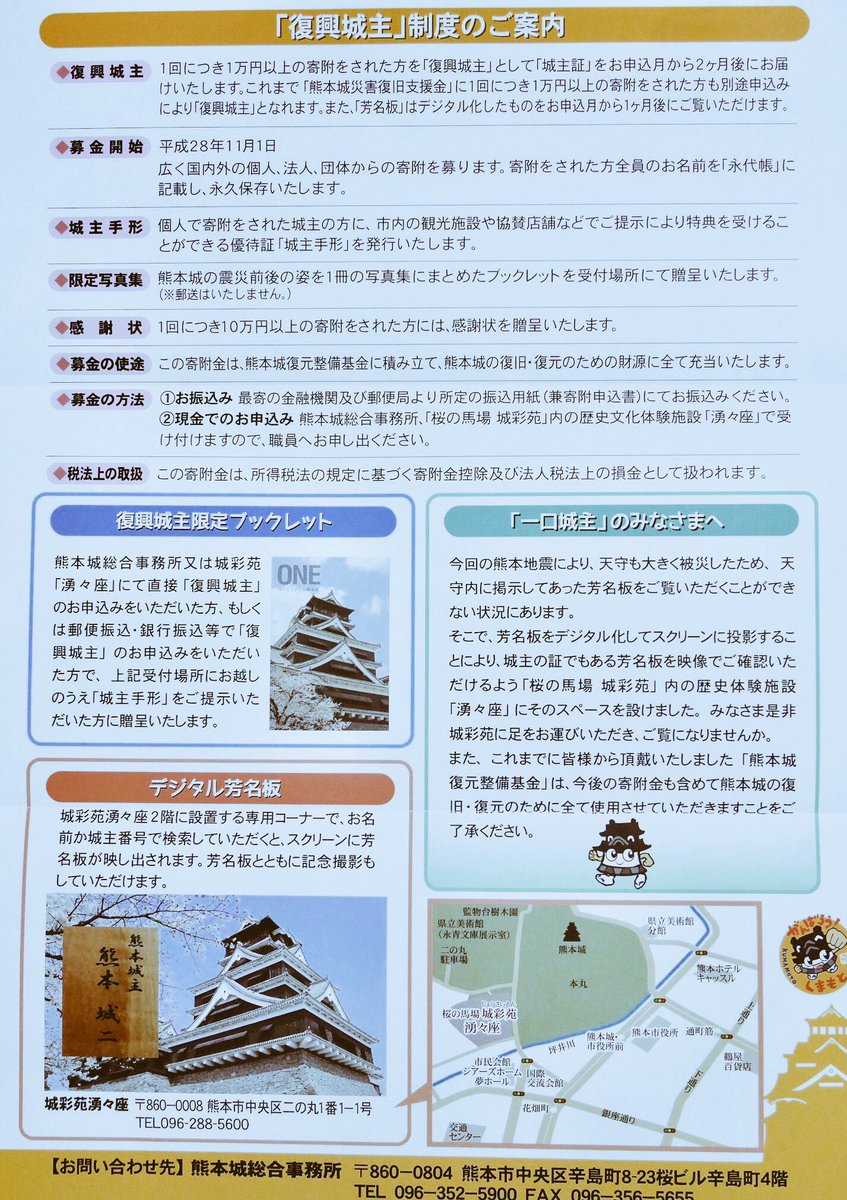 ◆復興城主 1回につき1万円以上の寄附をされた方を「復興城主」として「城主証」をお申込月から2ヶ月後にお届けいたします。これまで「熊本城災害復旧支援金」に1回につき1万円以上の寄附をされた方も別途申込みにより「復興城主」となれます。また、「芳名板」はデジタル化したものをお申込月から1ヶ月後にご覧いただけます。◆募金開始 平成28年11月1日