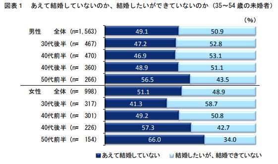 明治安田生活福祉研究所が35歳から54歳の男女1万人を対象に行った結婚意識に関する調査によりますと、未婚者の49%が「あえて結婚していない」と答え、「結婚したいができていない」の51%とほぼ同数でした。