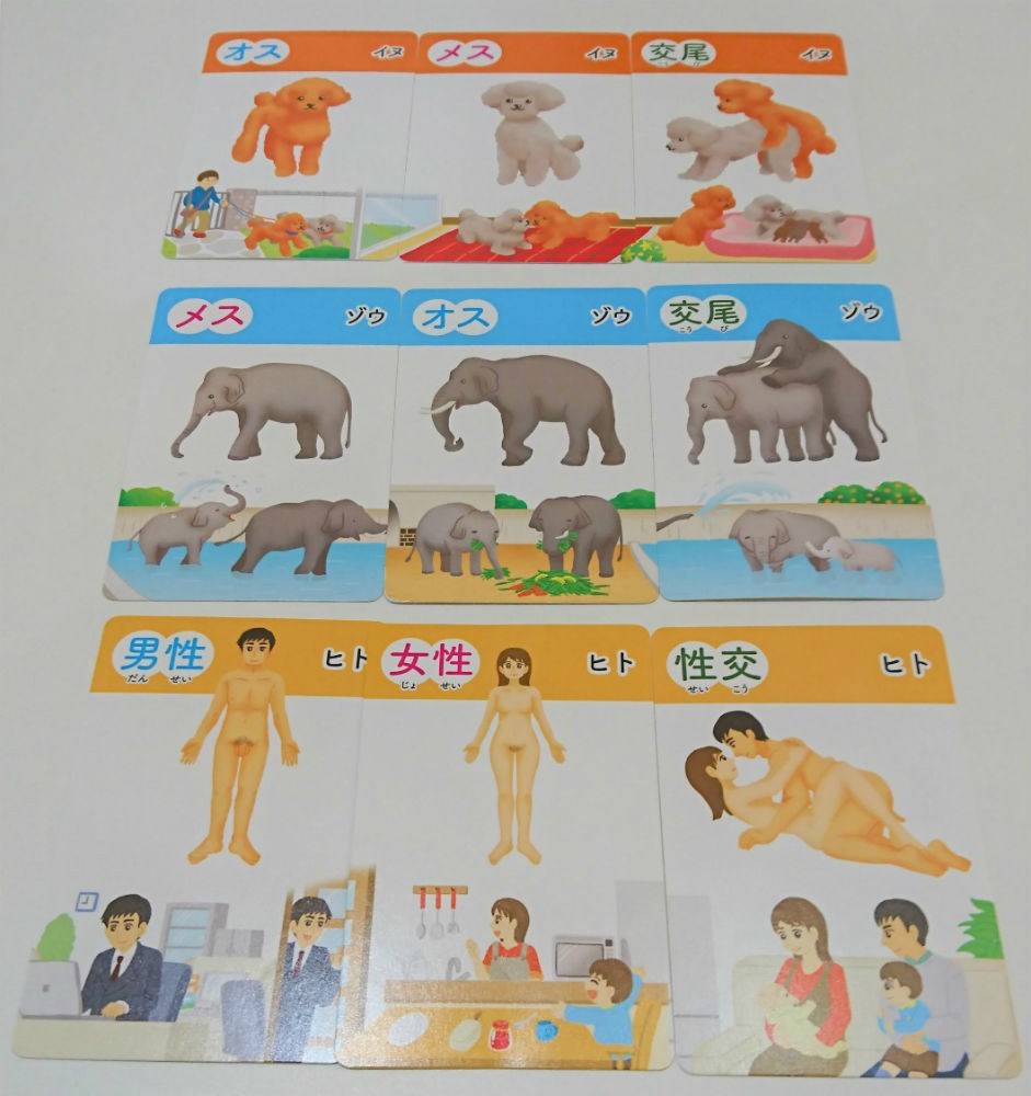 ゲームのカードには、メダカやイルカ、カタツムリ、キリン、ゾウなど17種類の生き物のイラストが描かれ、それぞれ「オス」「メス」「交尾」(人間は「男性」「女性」「性交」)の3種類があります。カードを引いて同じ生き物の3種類を集めれば高得点になり、