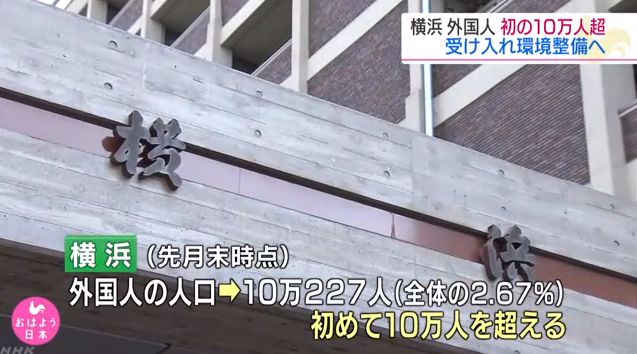 横浜市によりますと、市の住民基本台帳に記載された先月末時点の外国人の人口は全体の2.67%にあたる10万227人となり、初めて10万人を超えました。